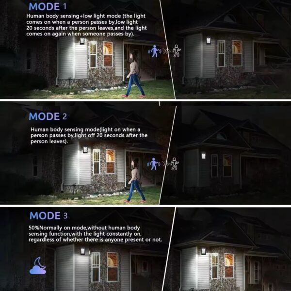 - Mode 2: Dim light stays on; full brightness activates when motion is detected.